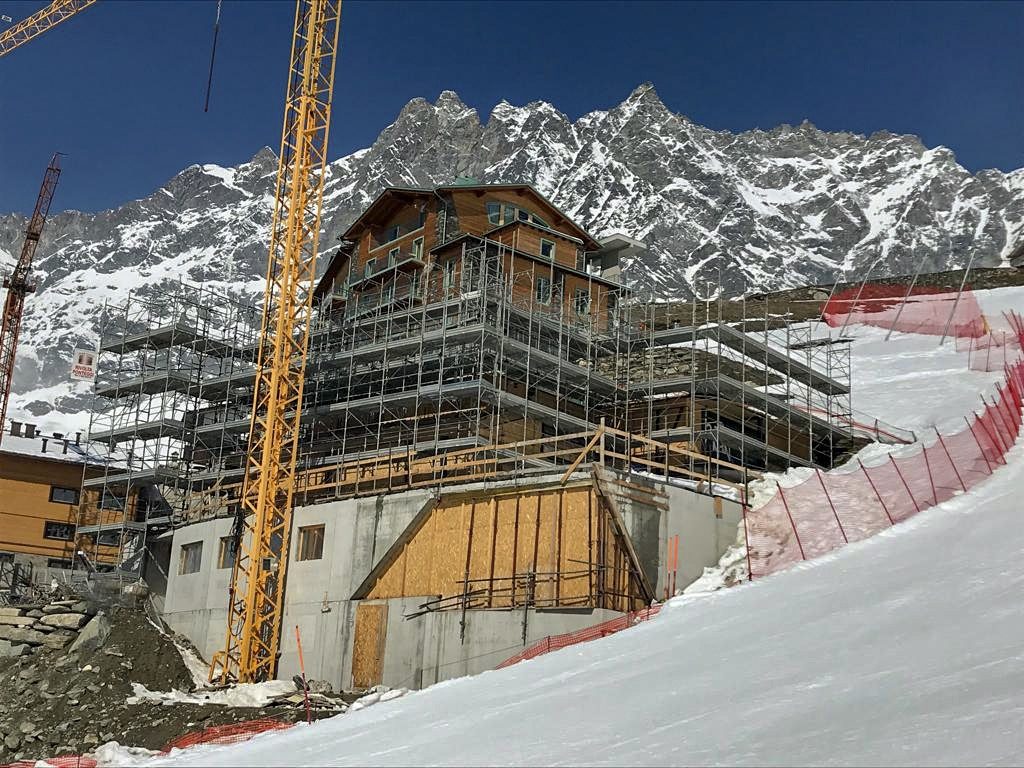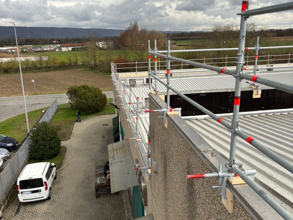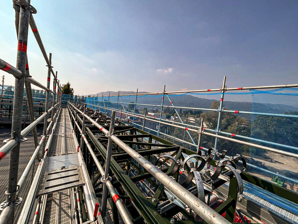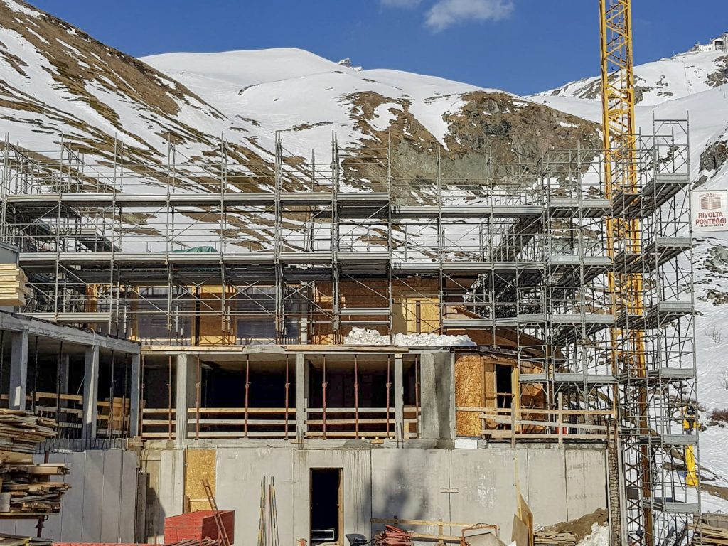 All scaffolding structures are designed and verified by certified engineers, considering wind loads, snow loads and the specific environmental conditions of the Aosta Valley.